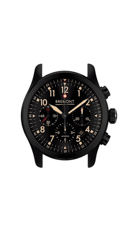 Hardened stainless steel Bremont Trip-Tick® construction with scratch resistant DLC treated case barrel. Case diameter 43mm, lug width 22mm, case thickness 16mm.