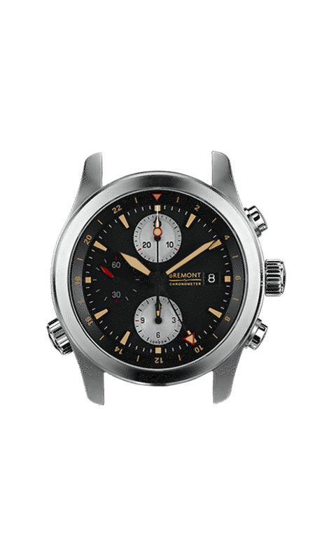 Hardened stainless steel Bremont Trip-Tick® construction with scratch resistant DLC treated case barrel. Case diameter 43mm, lug width 22mm, case thickness 16mm. Patented inner bi-directional Roto-Click® bezel. Operated by crown at 8H.
