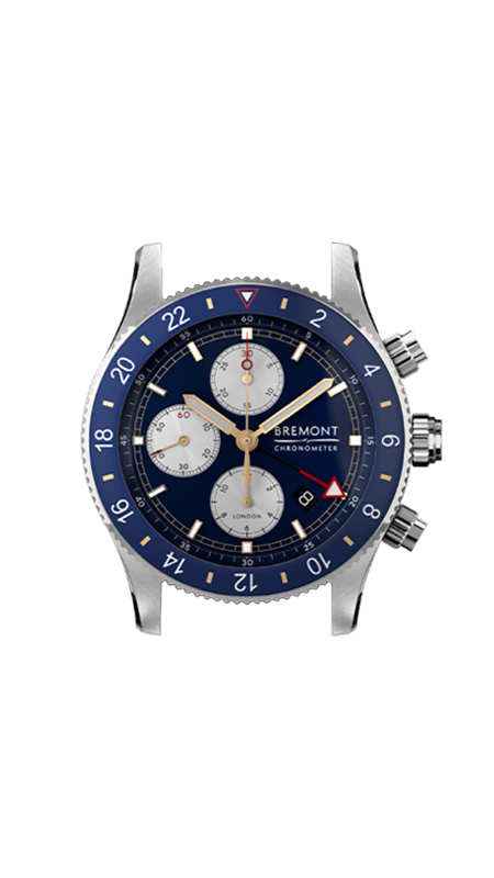 Stainless steel Bremont Trip-Tick case construction with scratch resistant PVD treated case barrel. Bi-directional rotating laser engraved ceramic bezel. Screw down with a pair of screw down chronograph pushers. Case Diameter 43mm. Case Depth 15.87mm. Lug width 22mm.